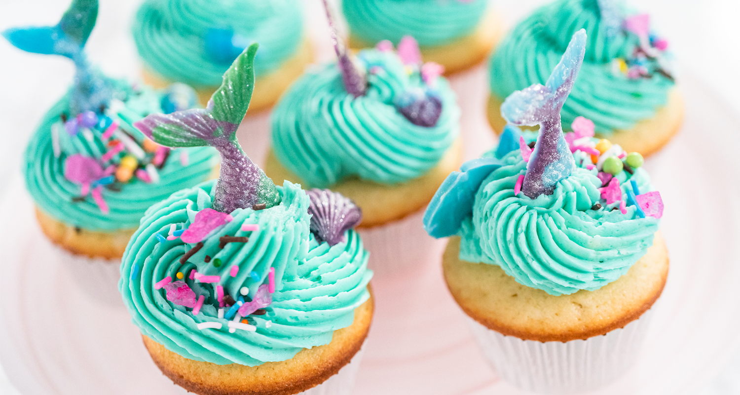 • Steek de zeemeerminnenstaart boven in de cupcake: