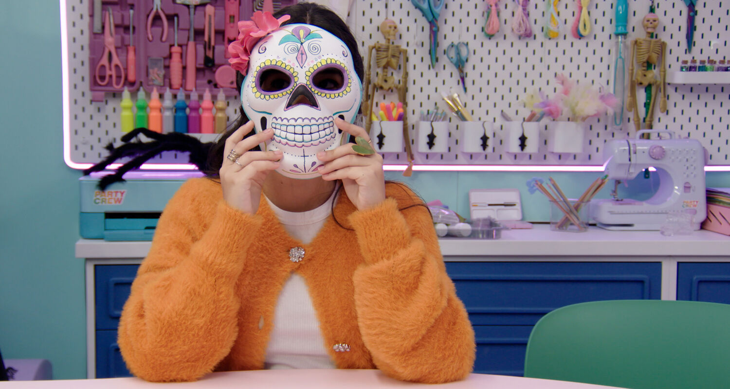 3. Pak je kunstbloemen en plak of prik ze bovenaan het masker. Zo krijg je dat typische Día de los Muertos gevoel — feestelijk én mysterieus.