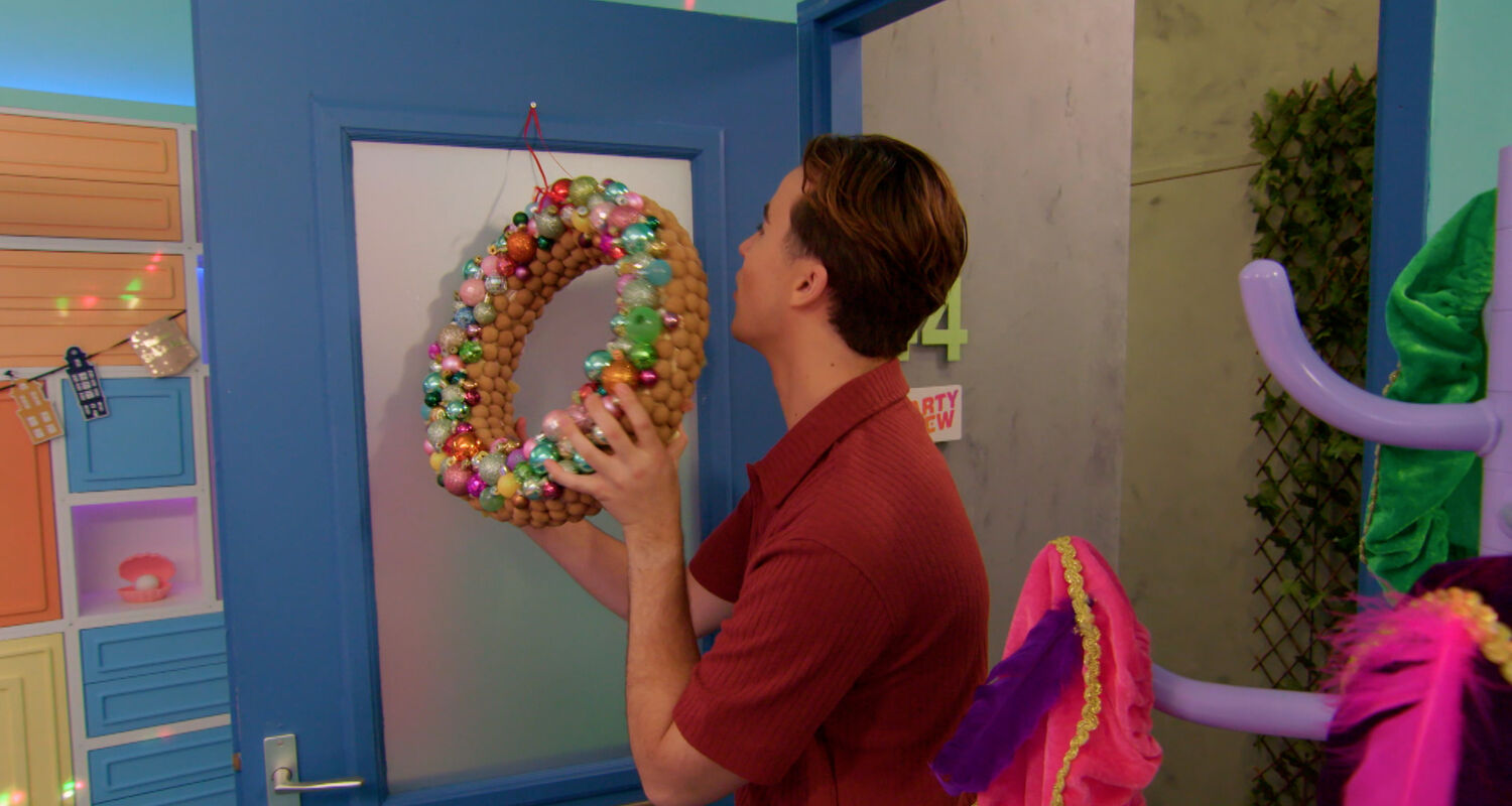 4. Tijd voor kerstglitter! Aan de andere kant van de krans plak je allemaal mini-kerstballen. Gebruik grote, kleine, veel verschillende kleuren — lekker mixen! Begin met de grote ballen en plak dan de kleintjes ertussen voor een supervolle, vrolijke kerstkans.